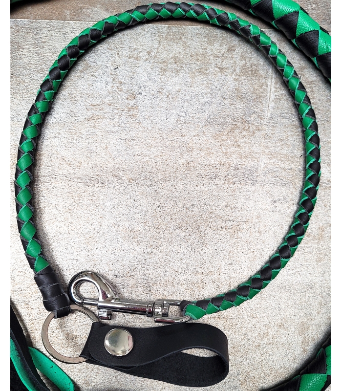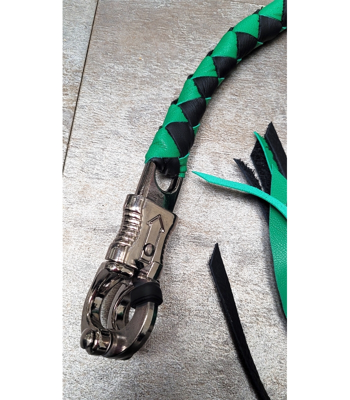 Ensemble fouet "whips" pour guidon de moto et lacet portefeuille vert et noir en cuir pour moto.