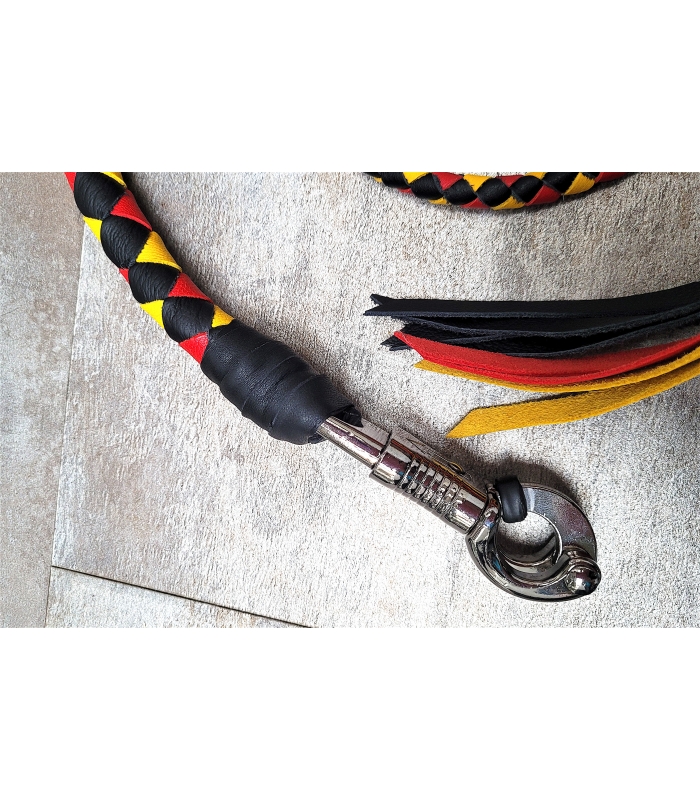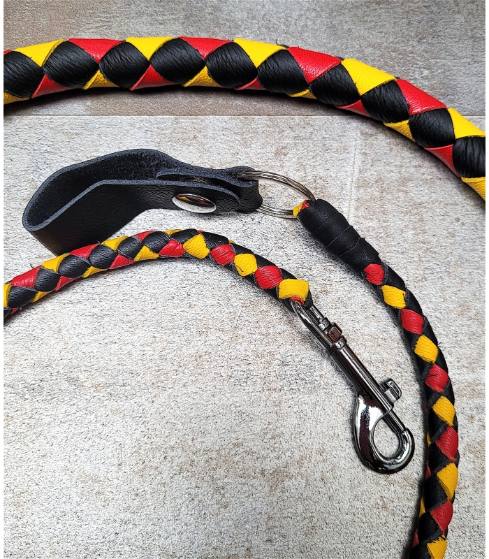 Ensemble fouet "whips" pour guidon de moto et lacet portefeuille rouge, jaune et noir en cuir pour moto.