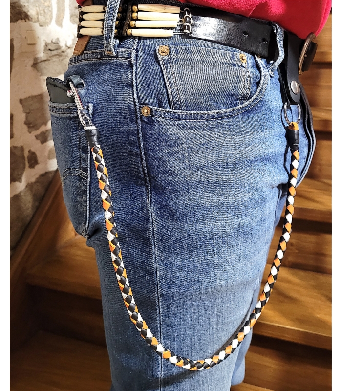 Ensemble fouet "whips" pour guidon de moto et lacet portefeuille orange, noir et blanc en cuir pour moto.
