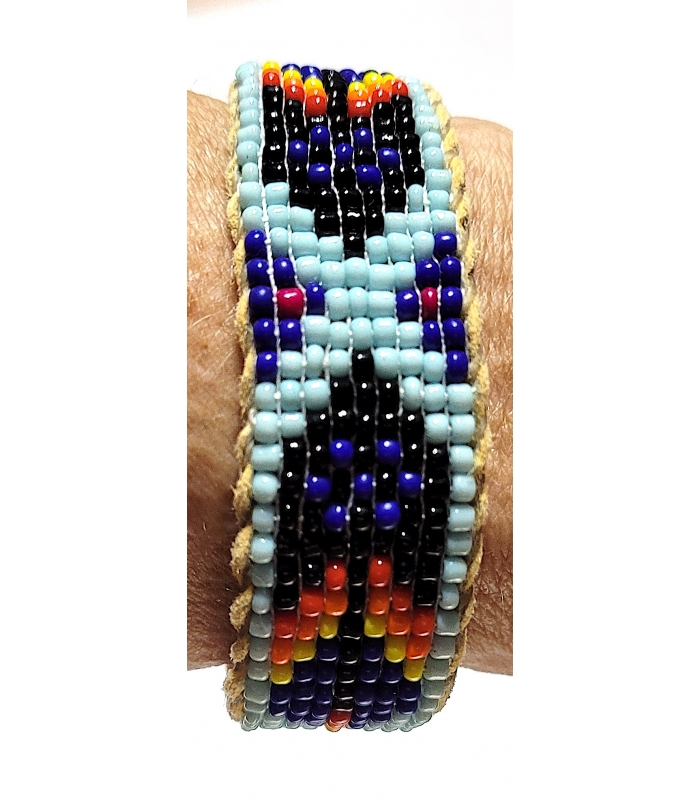 Bracelet perlé amerindien bleu ciel, bleu nuit, orange, jaune, noir et violine