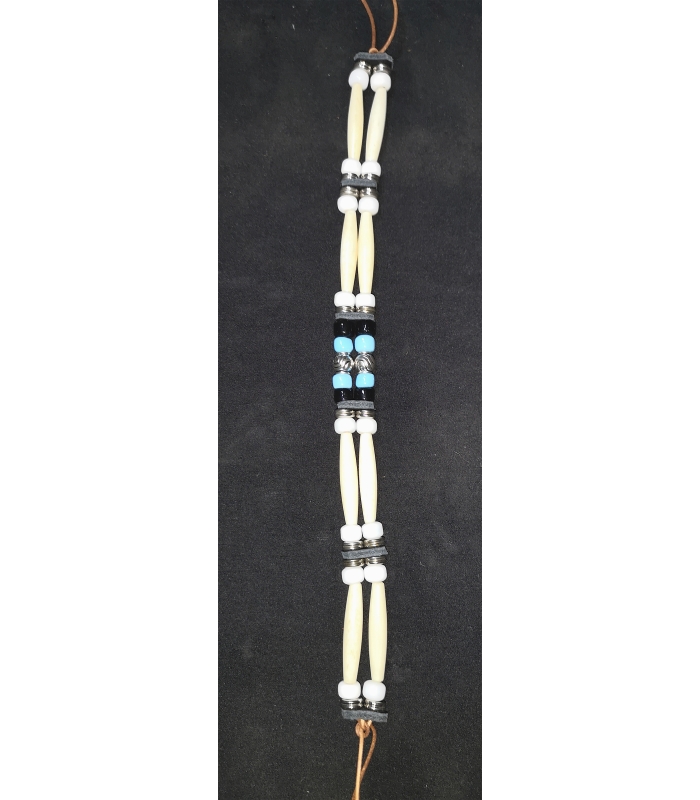 Collier en os et perles bleues et blanches et métal monté sur cuir marron