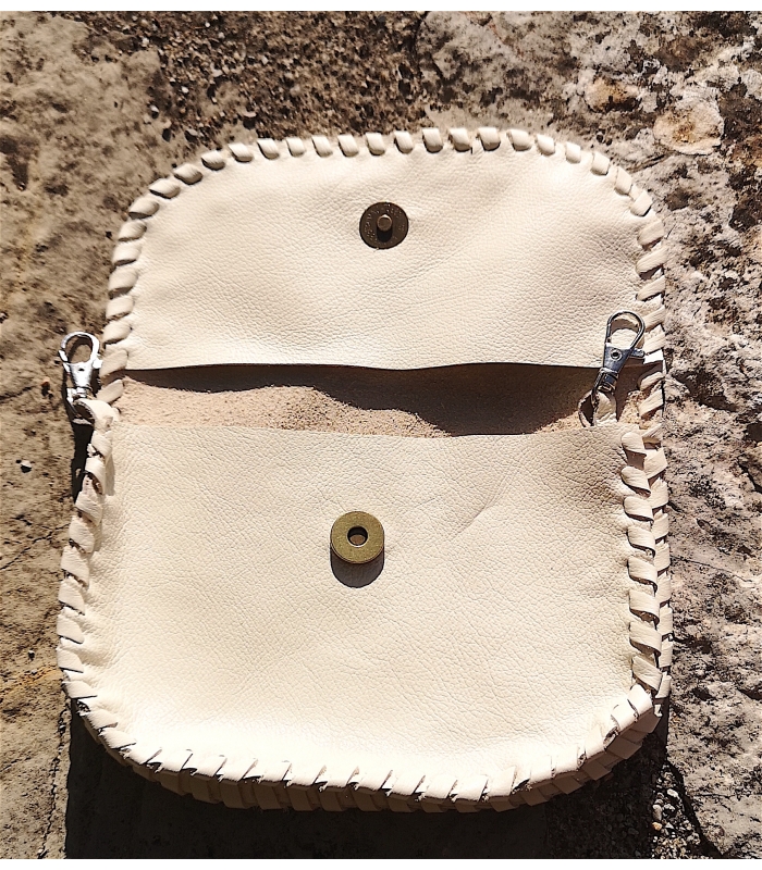 Pochette en cuir blanc forme demie lune fait main rivets décoratifs couleur métal argent